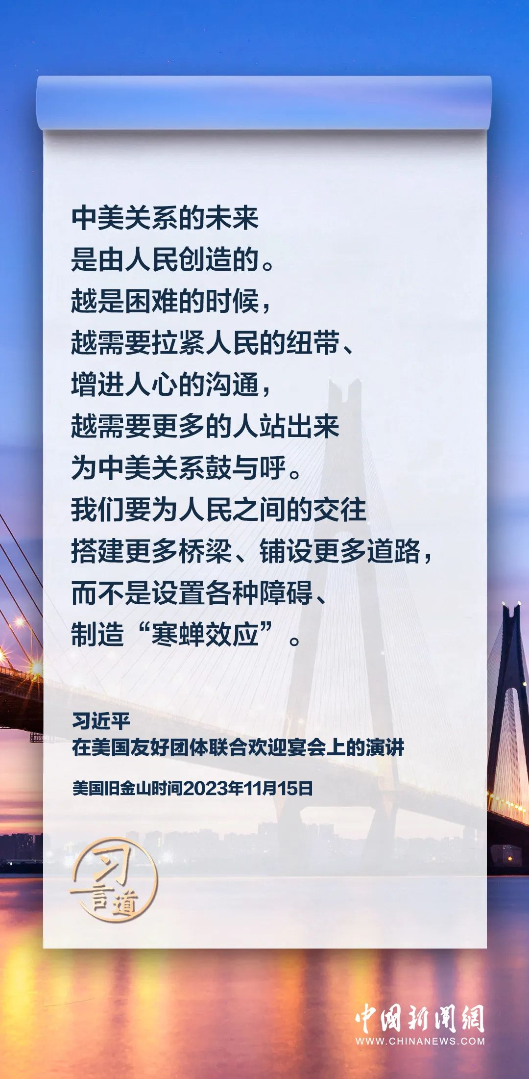 当地时间11月15日,中国国家主席习近平在美国旧金山出席美国友好团体联合欢迎宴会并发表演讲。习近平在演讲中从“我”和“我们”说起,提出中国主张、表明中国立场、展现大国担当,话语掷地有声。